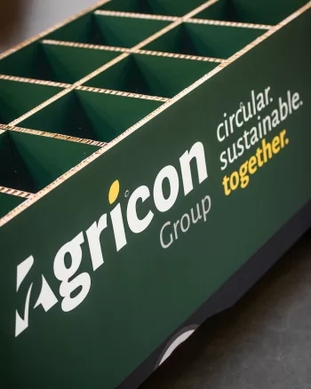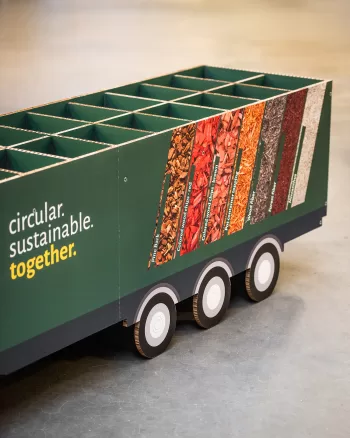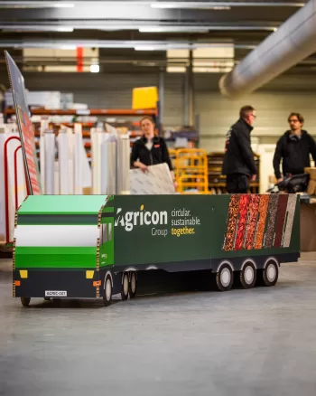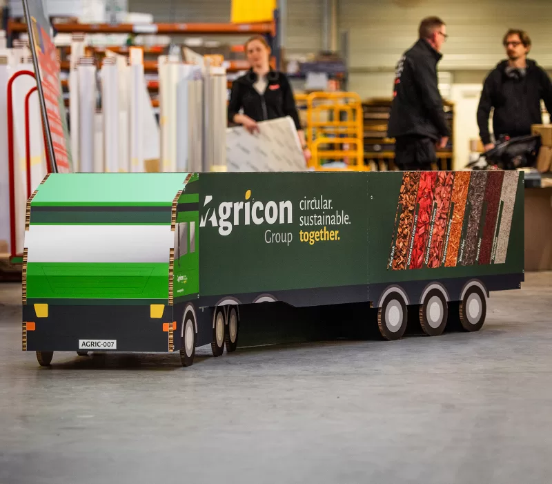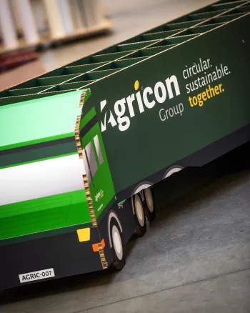 Voor Agricon realiseerden we een opvallend en creatief printproject dat meteen de aandacht trok op de beursvloer. We ontwierpen en printen een vrachtwagen met oplegger in honingraad karton, volledig op maat uitgewerkt als eyecatcher voor hun beursstand.