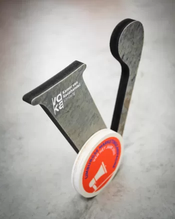 Geprint op het duurzame, steengeïnspireerde materiaal van STONEABLE, afgewerkt met een zwarte MDF-body en de uitgesneden V van Voka. Het resultaat? Awards die meteen binnenkomen. Stoer, strak en met karakter. Tastbaar printwerk dat spreekt. Ja, letterlijk.